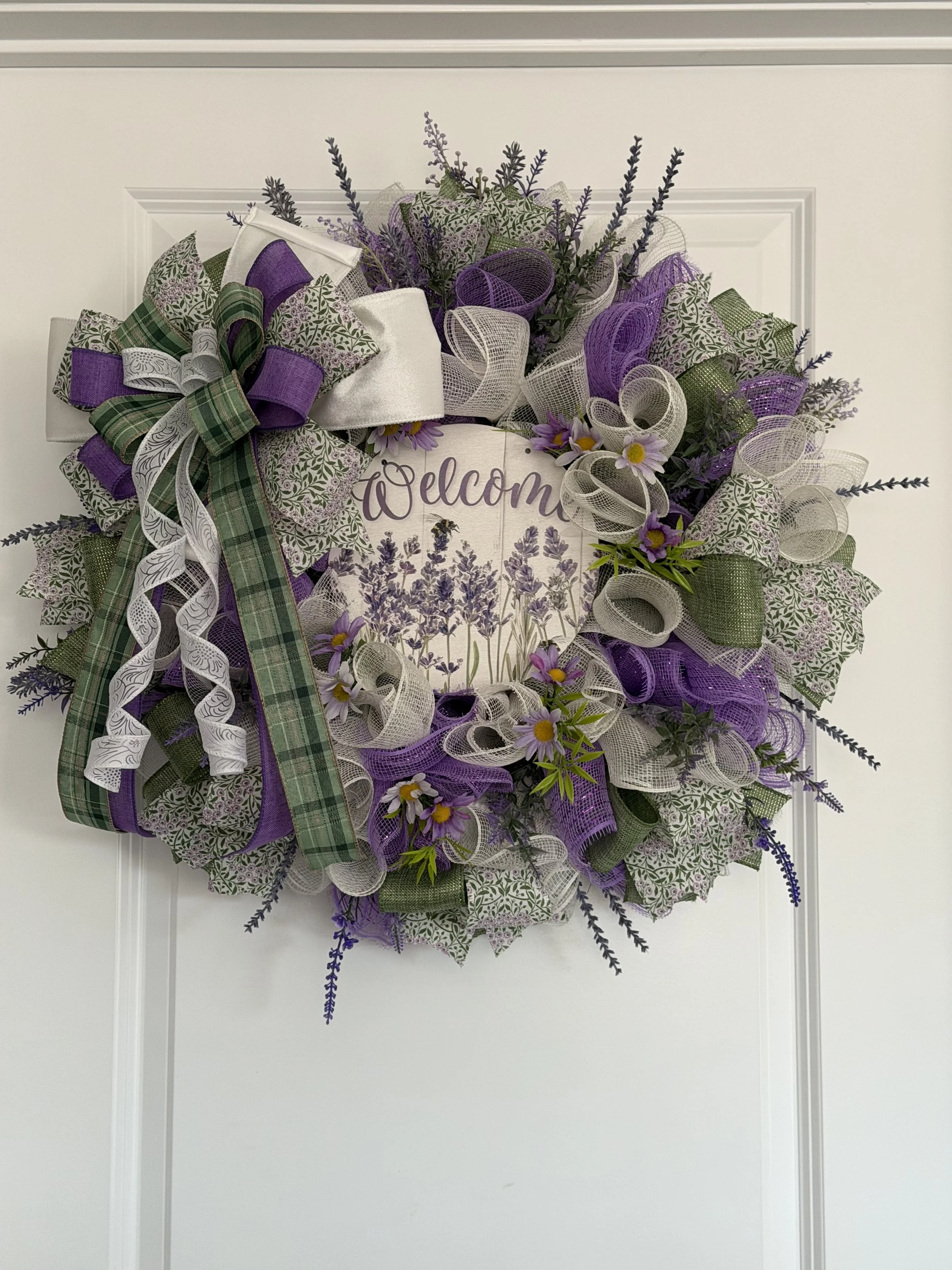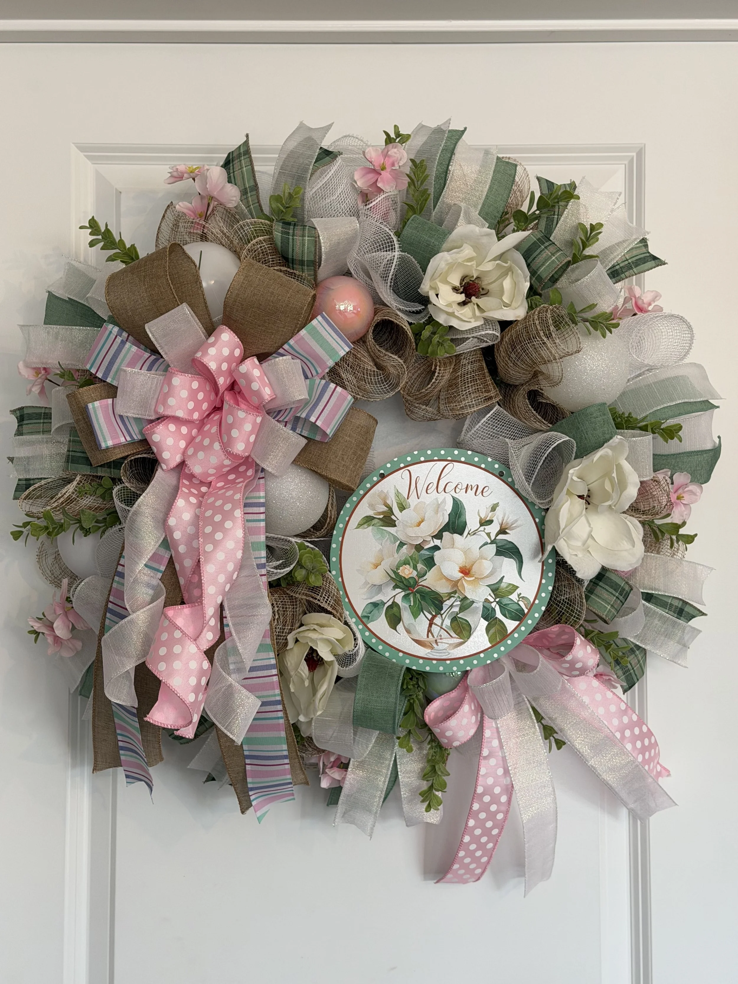 This “Welcome” wreath measures approximately 28 inches wide by 28 inches in length. $60 plus shipping.
